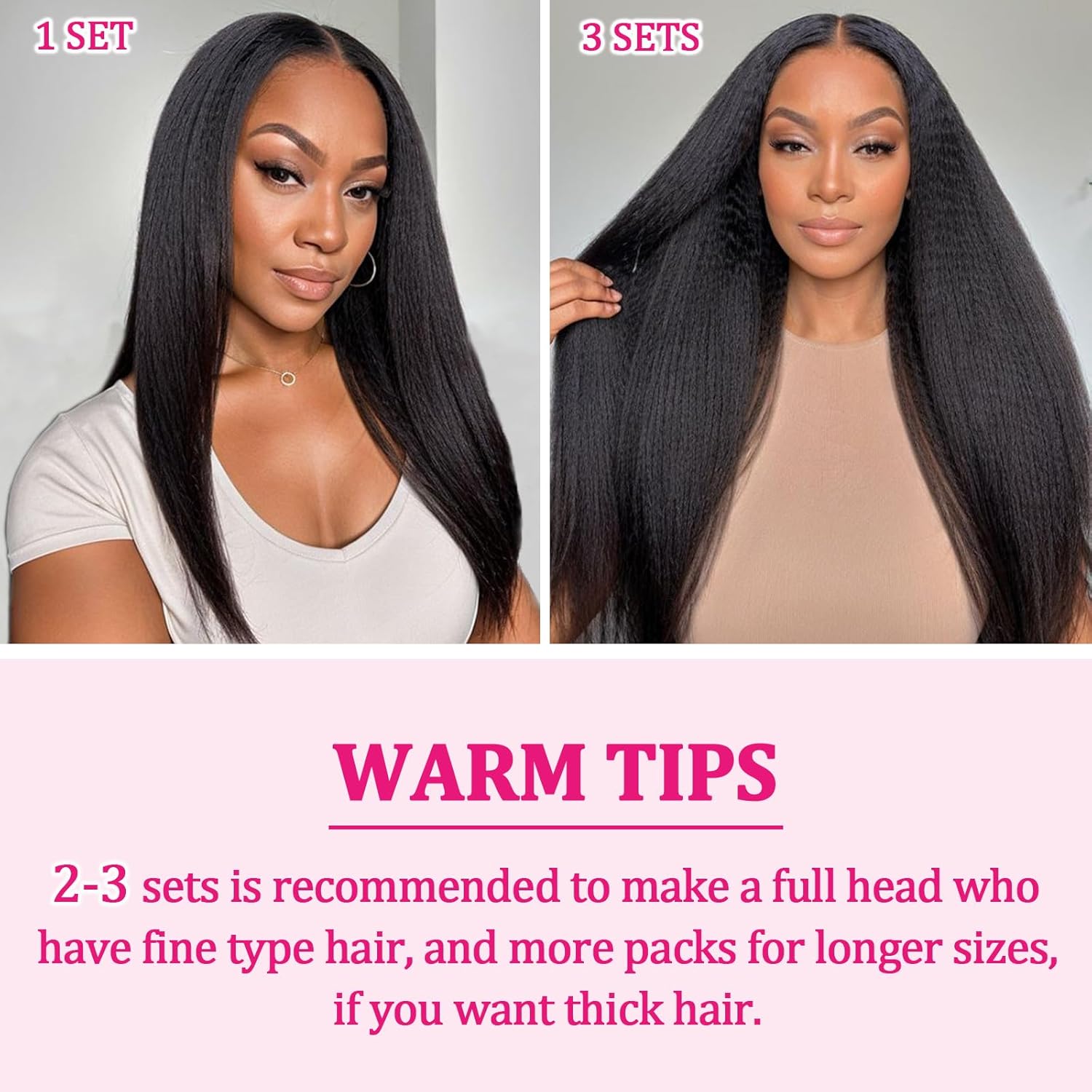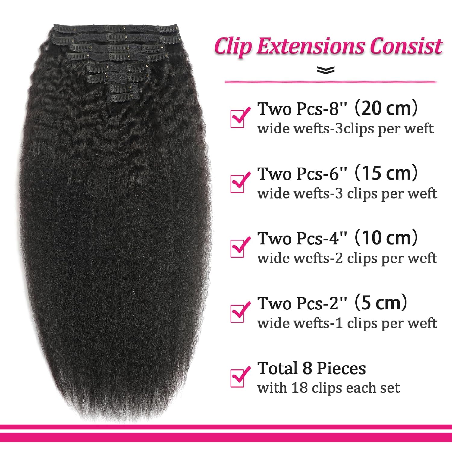 Clip in Hair Extensions Specification: Kinky straight clip in hair extensions, 8Pcs with 18 clips per set. Various lengths are available. If you want to add volume to your hair, we recommend 2 sets. If you want a full head of hair, we recommend 3 or more sets.